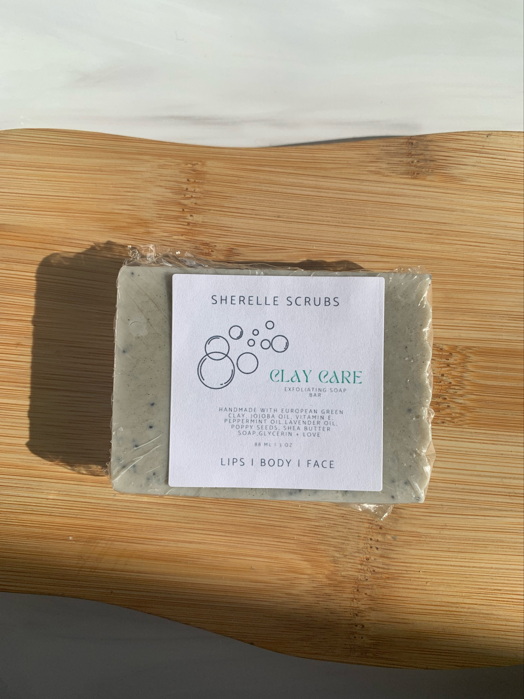A cleansing exfoliating European green clay, peppermint and lavender face & body bar handcrafted with shea butter soap base, peppermint oil, lavender oil, and poppy seeds to experience a gentle yet effective exfoliation, perfectly made for all skin types! BEST FOR TREATING CLOGGED PORES, EXCESS OIL AND FIRMING DULL SKIN.